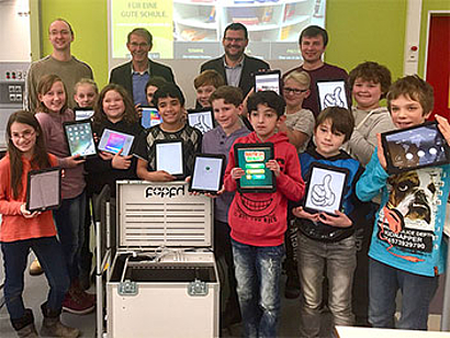 Passend zum Nikolaustag am vergangenen Mittwoch brachte Bürgermeister Michael Kessler tolle „Geschenke“ für die Schüler. Übergeben wurden an diesem Morgen offiziell die ersten beiden Koffer mit insgesamt 32 Tablets für den Unterricht. Die Schüler hatten strahlende Gesichter und freuten sich gemeinsam mit den Lehrkräften und der Schulleitung! Computer und Tablets im Unterricht, Lernen mit neuen Medien, der Einsatz des Internets im Fachunterricht, Erklärvideos ansehen und produzieren – die Bereitstellung einer digitalen Lernumgebung für Schüleraufgaben und zur Kommunikation Schüler-Lehrkräfte-Eltern – diese Ziele werden nicht mehr in Frage gestellt, sondern sind eine der zentralen Aufgaben der Schulentwicklung einer Gemeinschaftsschule.