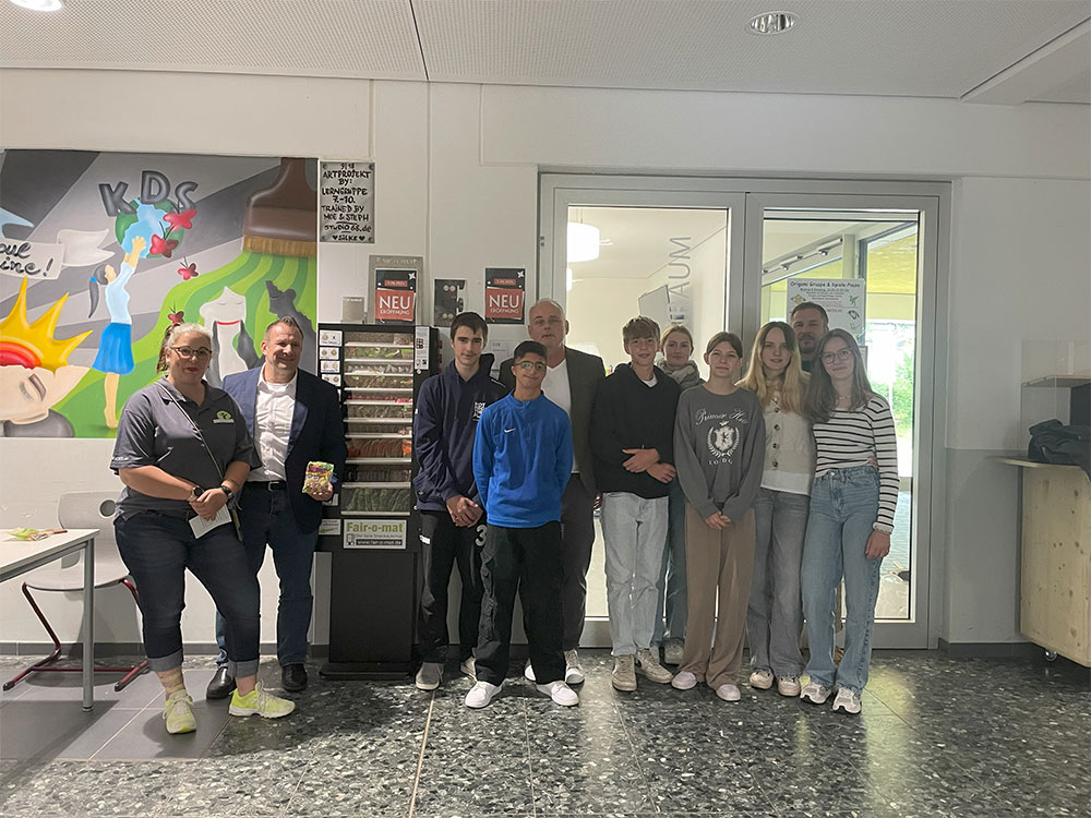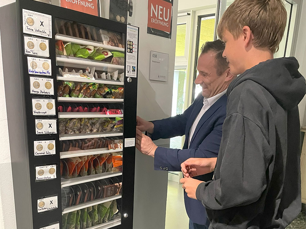 Ein besonderer Dank gilt den großzügigen Spendern, die dieses Projekt ermöglicht haben. Die Hauptfinanzierung wurde durch die Rhein-Neckar-Helden der Volks- und Raiffeisenbanken gesichert. Auch die Geemeinde hat einen bedeutenden Teil zur Finanzierung beigetragen. Wir bedanken uns an dieser Stelle herzlich bei allen Unterstützern! Der Betrieb des Fair-o-maten wird von einer engagierten Schülerfirma übernommen, die zusammen mit ihrem Lehrer Benjamin Mosthaf für den Nachschub sorgt. Bereits die kurze Testphase hat gezeigt, dass die Produkte von unseren Schüler:innen sehr gut angenommen werden. Die Schülerfirma beschäftigt sich intensiv mit dem Thema „fairer Handel“ und setzt sich dafür ein, dass immer ausreichend fair gehandelte Produkte verfügbar sind. Wir sind stolz auf dieses Projekt und freuen uns, dass unsere Schule einen weiteren Schritt in Richtung Nachhaltigkeit und fairen Handel geht.