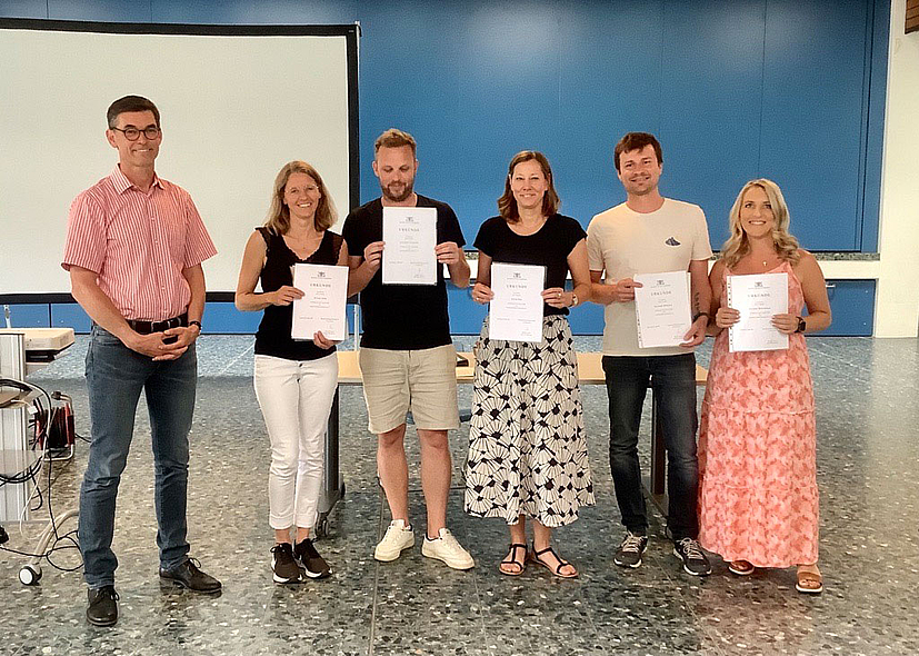 Einige KollegInnen haben den „Horizontalen Laufbahnwechsel“ gemacht - eine einjährige, berufsbegleitende Fortbildung zur Sekunderstufe 1-Lehrkraft. Hier seht Ihr ein Foto der Urkundenverleihung (von links: Schulrat Endrik Ebel, Frau Lang, Herr Gramlich, Frau Kuß, Herr Hübschen und Frau Hasselmann)