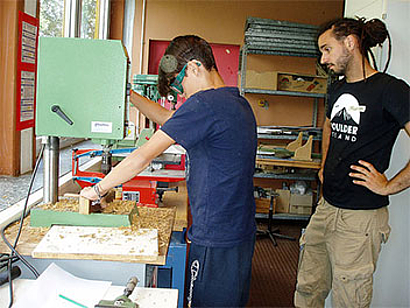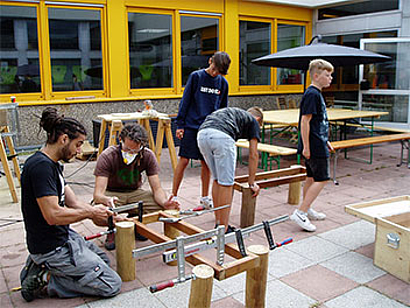 Schülerinnen und Schüler der KooBO-Werkstatt und die Handwerker der WERKstattSCHULE Heidelberg arbeiten gemeinsam an der Innenhofgestaltung.