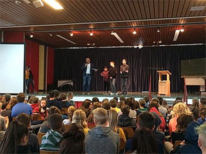 Am Donnerstag, 17.10.19 um 11.00 Uhr trafen sich die Schülerinnen und Schüler sowie alle Lehrkräfte zur ersten Vollversammlung im neuen Schuljahr 2019/20. Dieses Mal hatten Schüleri der Lerngruppen 7 das unterhaltsame Programm vorbereitet und die Versammlung moderiert. Drei Schülerinnen aus der Lerngruppe 7a hatten sich bereit erklärt, durch das Programm zu führen.